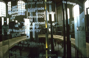 As a poet she works in between art and science. Her latest book of poetry On elements came in the autumn of 1998. At the same time the installation MUON, were the poem Muon Song is included, opened. The poem Muon Song mixes Swedish and English in the book as well as on the glass wall around the sculpture.